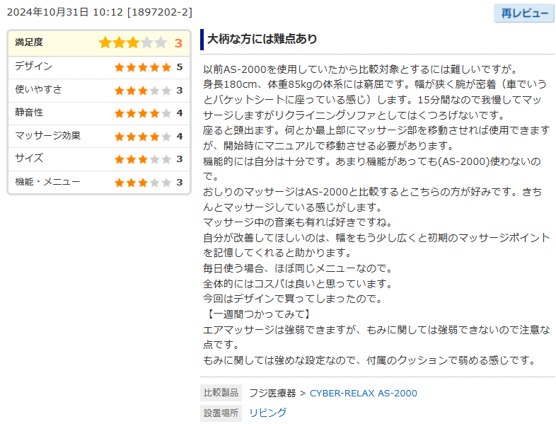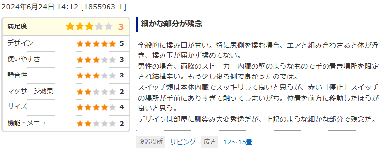 口コミを見ると、デザインと機能の両立で評価は高いものの、体格の大きい方や本格的な揉み心地を求める場合は、事前に試座することが失敗しないポイントのようです。